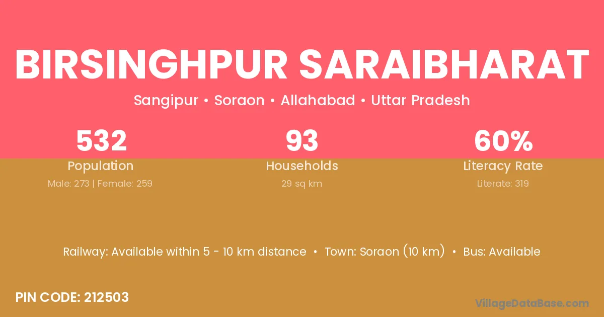 Birsinghpur Saraibharat village has a total population of 532 people, of which 273 are males and 259 are females.