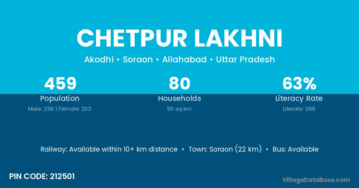 Soraon (22 km) is the nearest town to Chetpur Lakhni village for major economic activities and is located approximately 22 km away.
