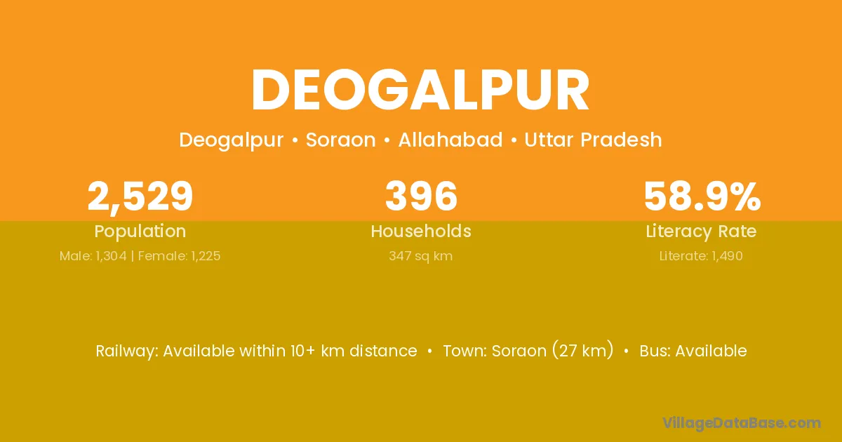 Soraon (27 km) is the nearest town to Deogalpur village for major economic activities and is located approximately 27 km away.