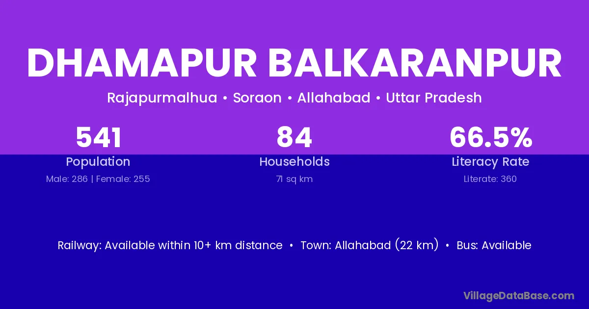Allahabad (22 km) is the nearest town to Dhamapur Balkaranpur village for major economic activities and is located approximately 22 km away.