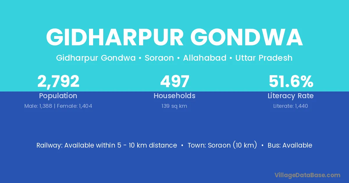 Soraon (10 km) is the nearest town to Gidharpur Gondwa village for major economic activities and is located approximately 10 km away.