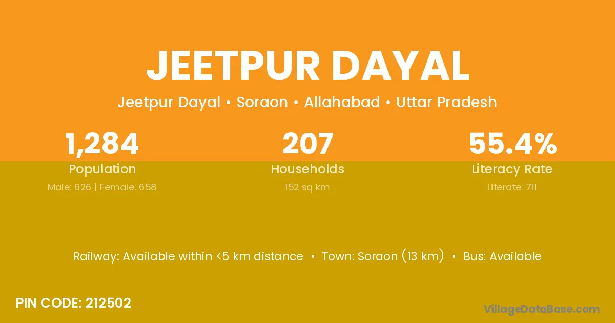 Soraon (13 km) is the nearest town to Jeetpur Dayal village for major economic activities and is located approximately 13 km away.