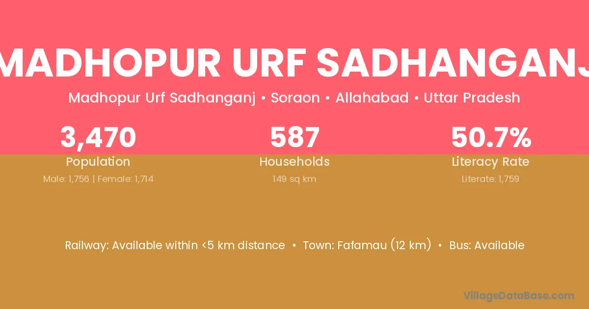 Madhopur Urf Sadhanganj village has a total population of 3,470 people, of which 1,756 are males and 1,714 are females.