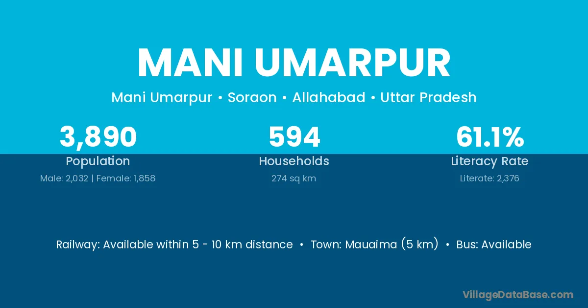 Mani Umarpur village has a total population of 3,890 people, of which 2,032 are males and 1,858 are females.