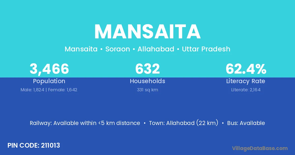 Allahabad (22 km) is the nearest town to Mansaita village for major economic activities and is located approximately 22 km away.