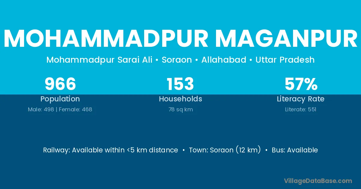 Soraon (12 km) is the nearest town to Mohammadpur Maganpur village for major economic activities and is located approximately 12 km away.