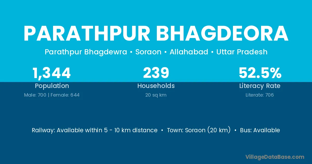 Soraon (20 km) is the nearest town to Parathpur Bhagdeora village for major economic activities and is located approximately 20 km away.