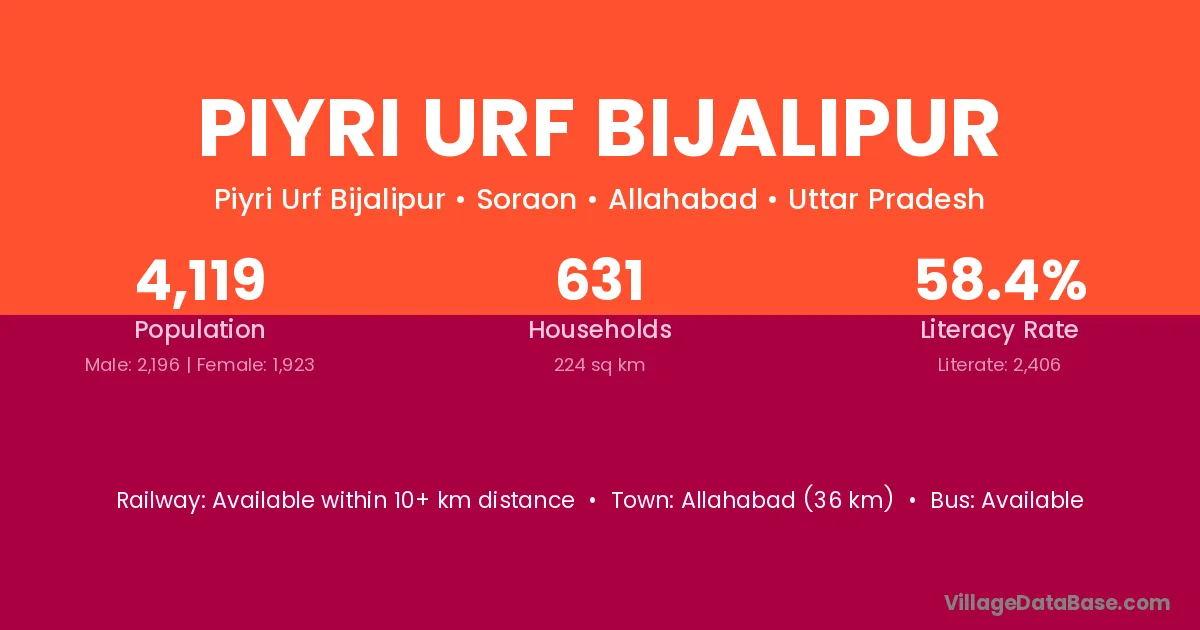 Allahabad (36 km) is the nearest town to Piyri Urf Bijalipur village for major economic activities and is located approximately 36 km away.