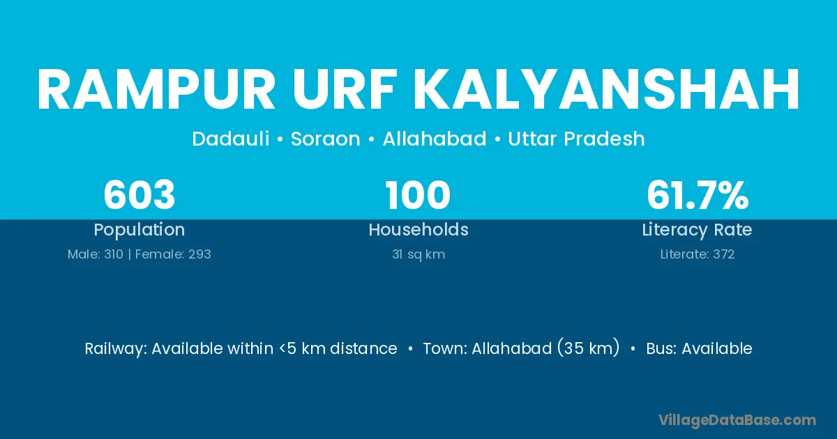 Allahabad (35 km) is the nearest town to Rampur Urf Kalyanshah village for major economic activities and is located approximately 35 km away.