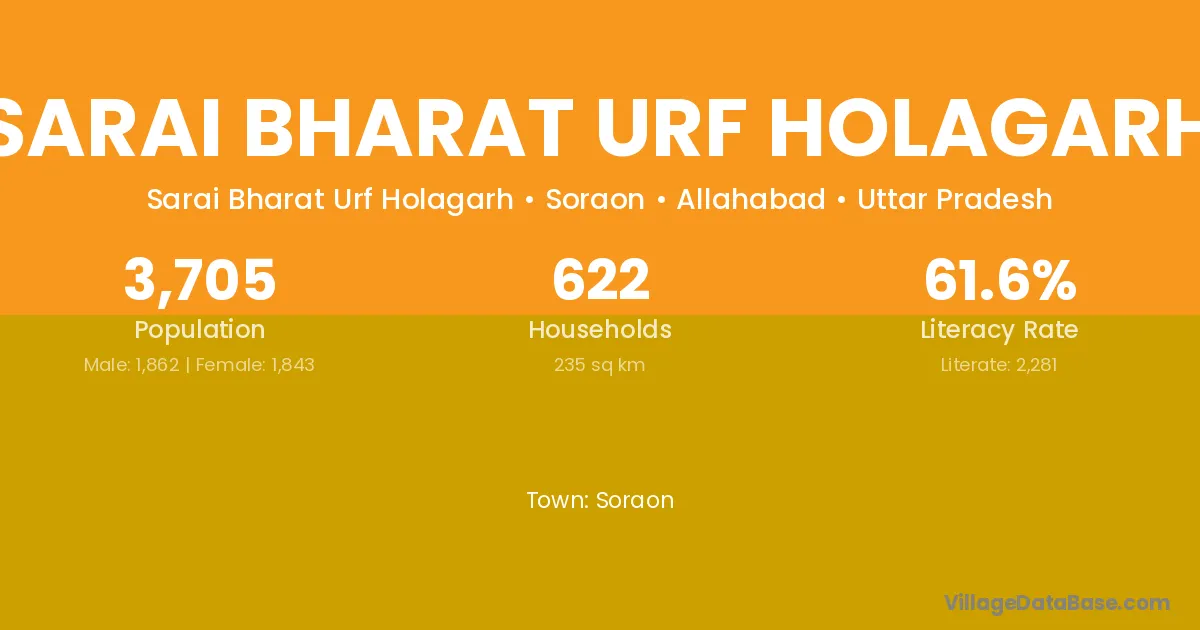 Sarai Bharat Urf Holagarh village has a total population of 3,705 people, of which 1,862 are males and 1,843 are females.