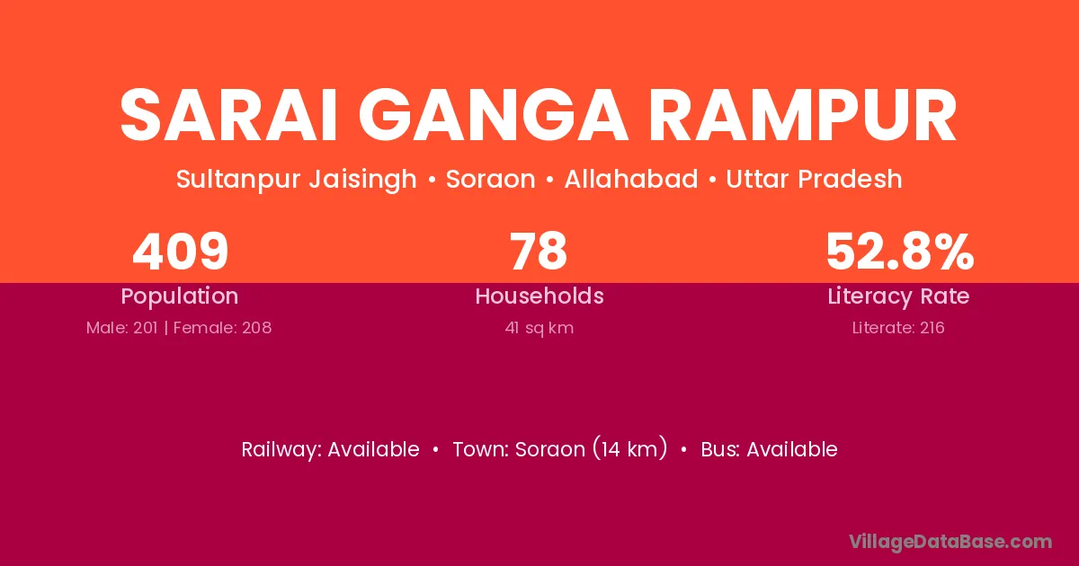 Sarai Ganga Rampur village has a total population of 409 people, of which 201 are males and 208 are females.
