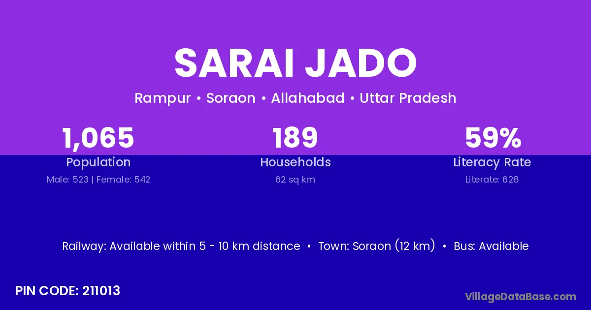 Soraon (12 km) is the nearest town to Sarai Jado village for major economic activities and is located approximately 12 km away.
