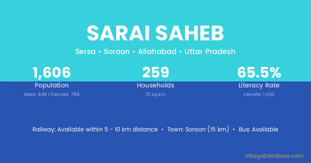 Soraon (15 km) is the nearest town to Sarai Saheb village for major economic activities and is located approximately 15 km away.