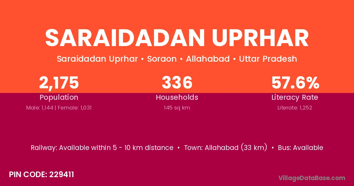 Allahabad (33 km) is the nearest town to Saraidadan Uprhar village for major economic activities and is located approximately 33 km away.
