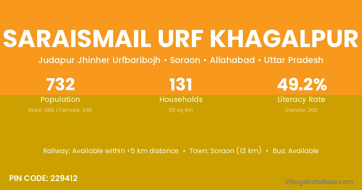 Soraon (13 km) is the nearest town to Saraismail Urf Khagalpur village for major economic activities and is located approximately 13 km away.