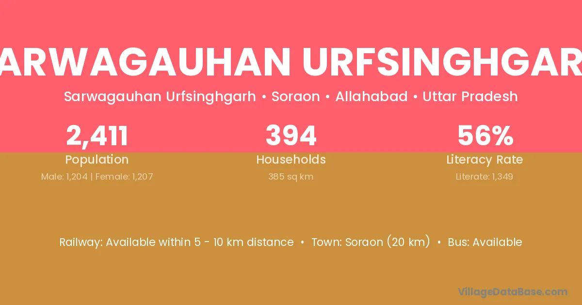 Soraon (20 km) is the nearest town to Sarwagauhan Urfsinghgarh village for major economic activities and is located approximately 20 km away.