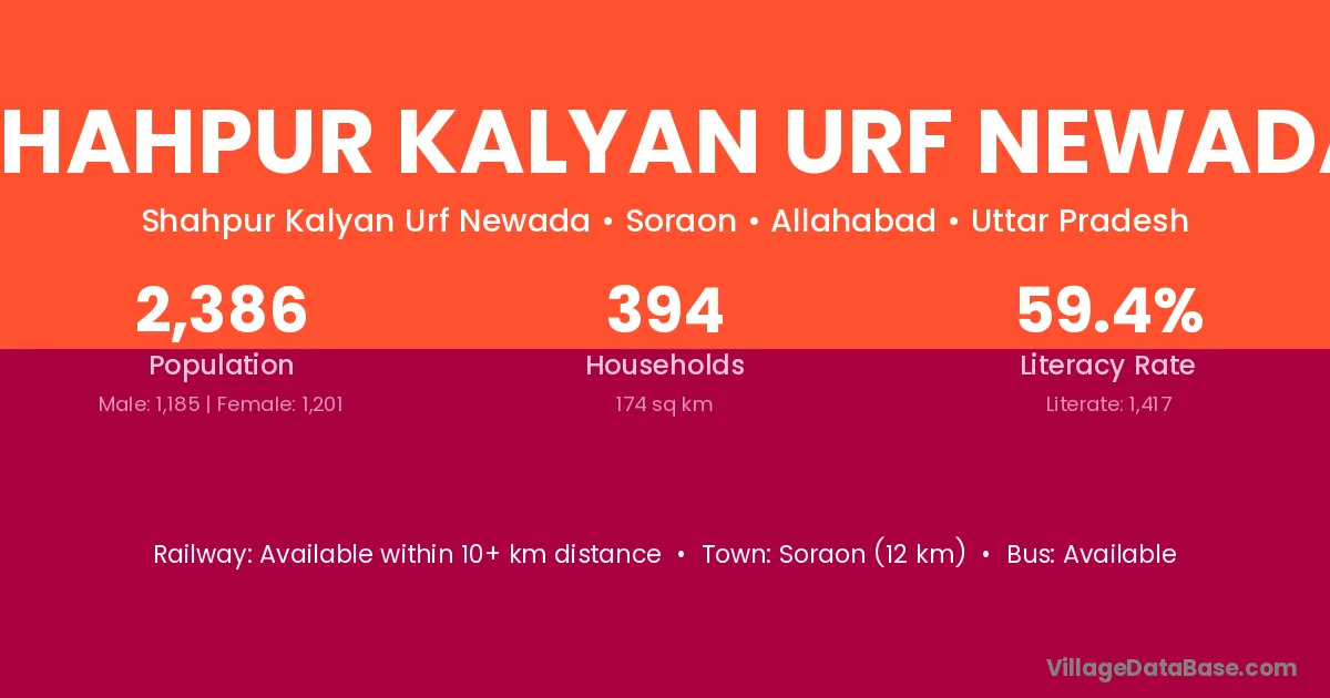 Soraon (12 km) is the nearest town to Shahpur Kalyan Urf Newada village for major economic activities and is located approximately 12 km away.