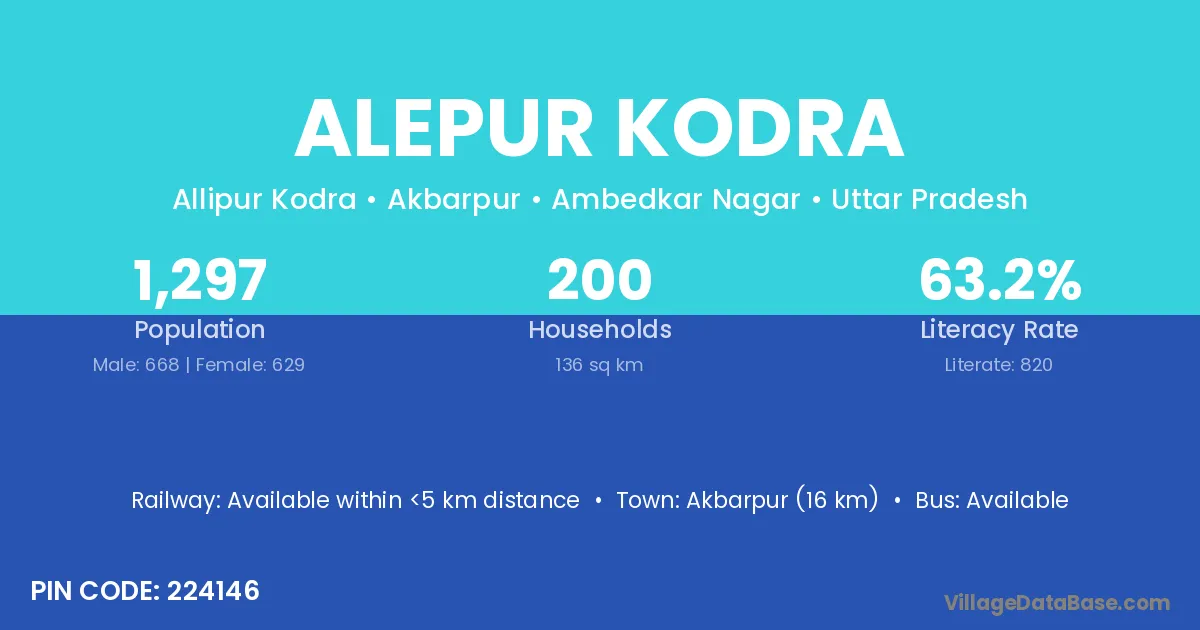 Akbarpur (16 km) is the nearest town to Alepur Kodra village for major economic activities and is located approximately 16 km away.