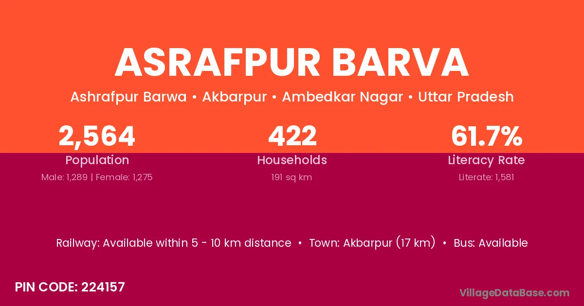 Akbarpur (17 km) is the nearest town to Asrafpur Barva village for major economic activities and is located approximately 17 km away.