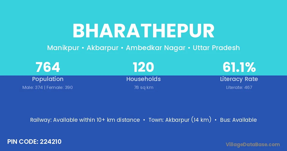 Akbarpur (14 km) is the nearest town to Bharathepur village for major economic activities and is located approximately 14 km away.