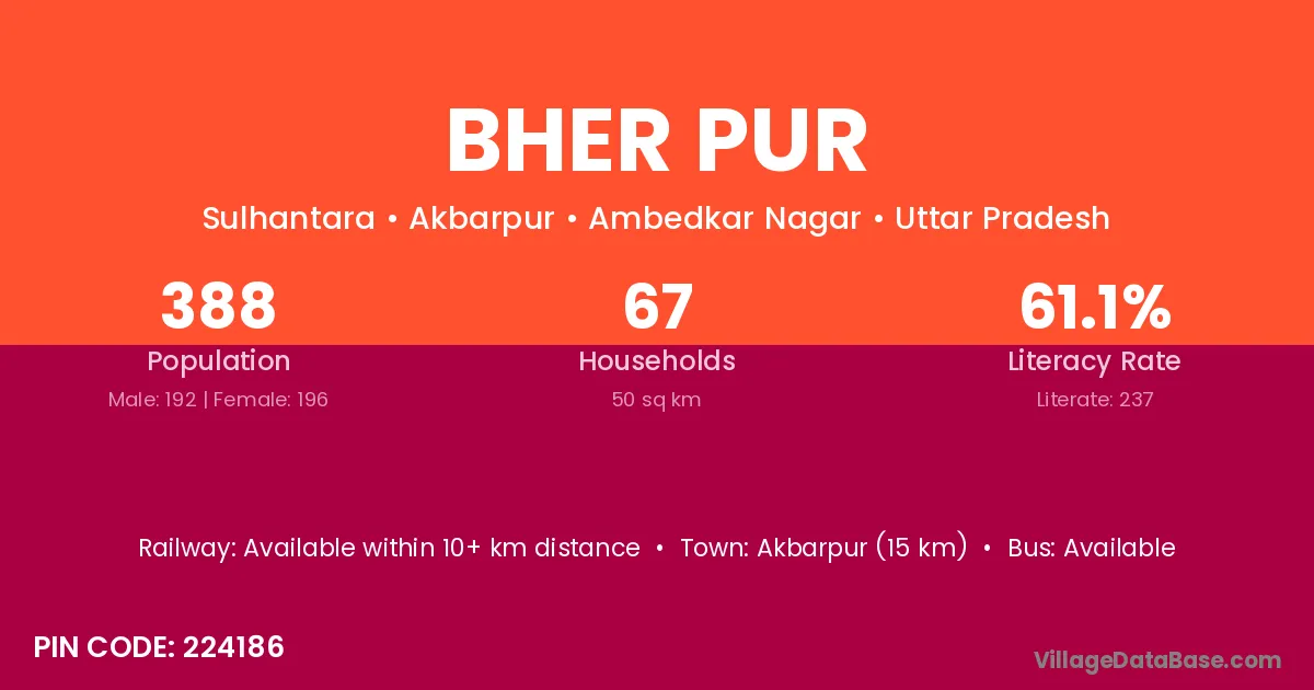 Akbarpur (15 km) is the nearest town to Bher Pur village for major economic activities and is located approximately 15 km away.