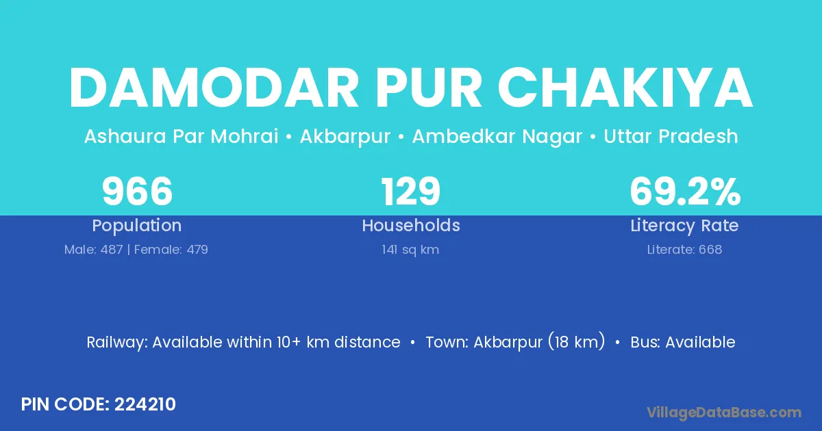 Akbarpur (18 km) is the nearest town to Damodar Pur Chakiya village for major economic activities and is located approximately 18 km away.