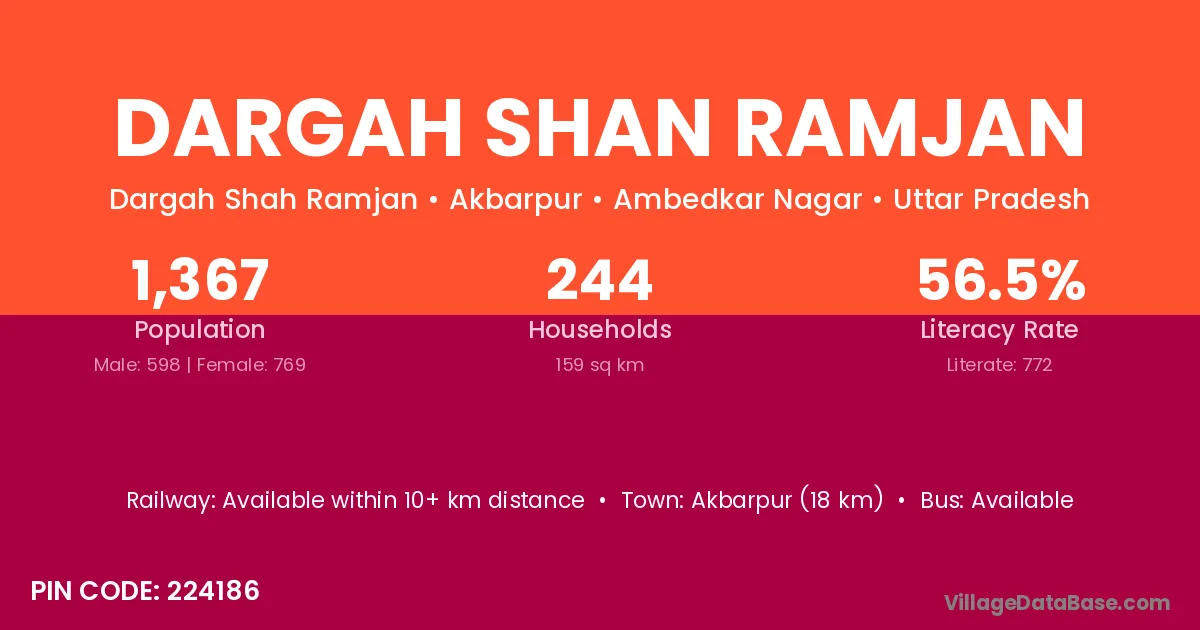 Akbarpur (18 km) is the nearest town to Dargah Shan Ramjan village for major economic activities and is located approximately 18 km away.