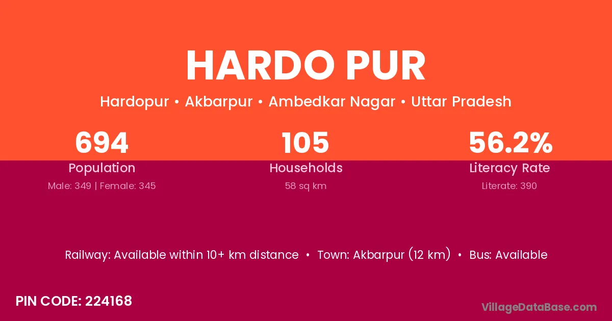 Akbarpur (12 km) is the nearest town to Hardo Pur village for major economic activities and is located approximately 12 km away.