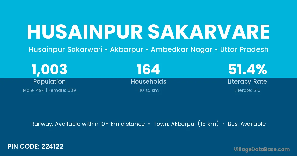 Akbarpur (15 km) is the nearest town to Husainpur Sakarvare village for major economic activities and is located approximately 15 km away.