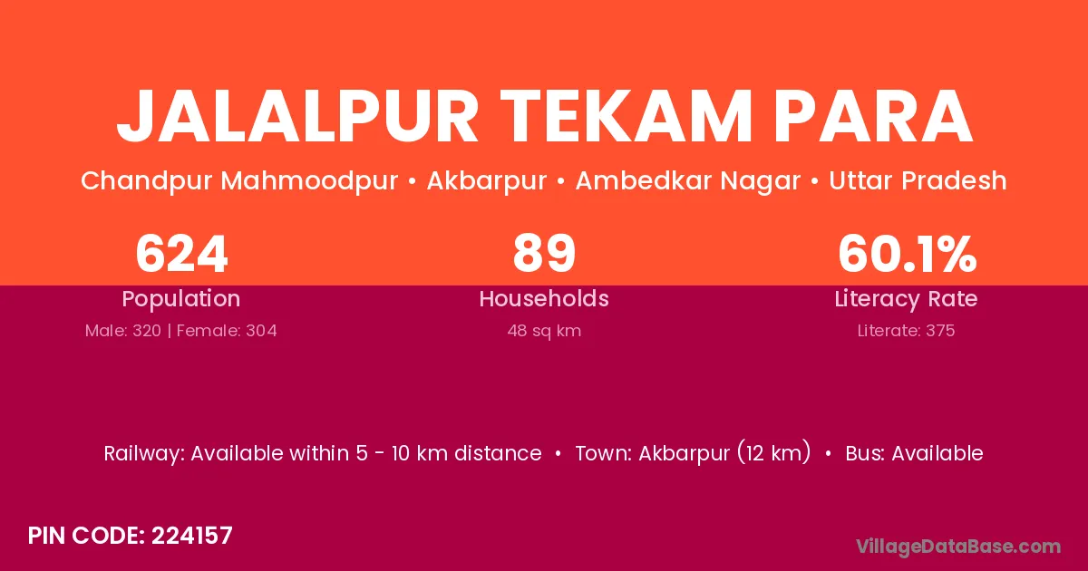 Akbarpur (12 km) is the nearest town to Jalalpur Tekam Para village for major economic activities and is located approximately 12 km away.