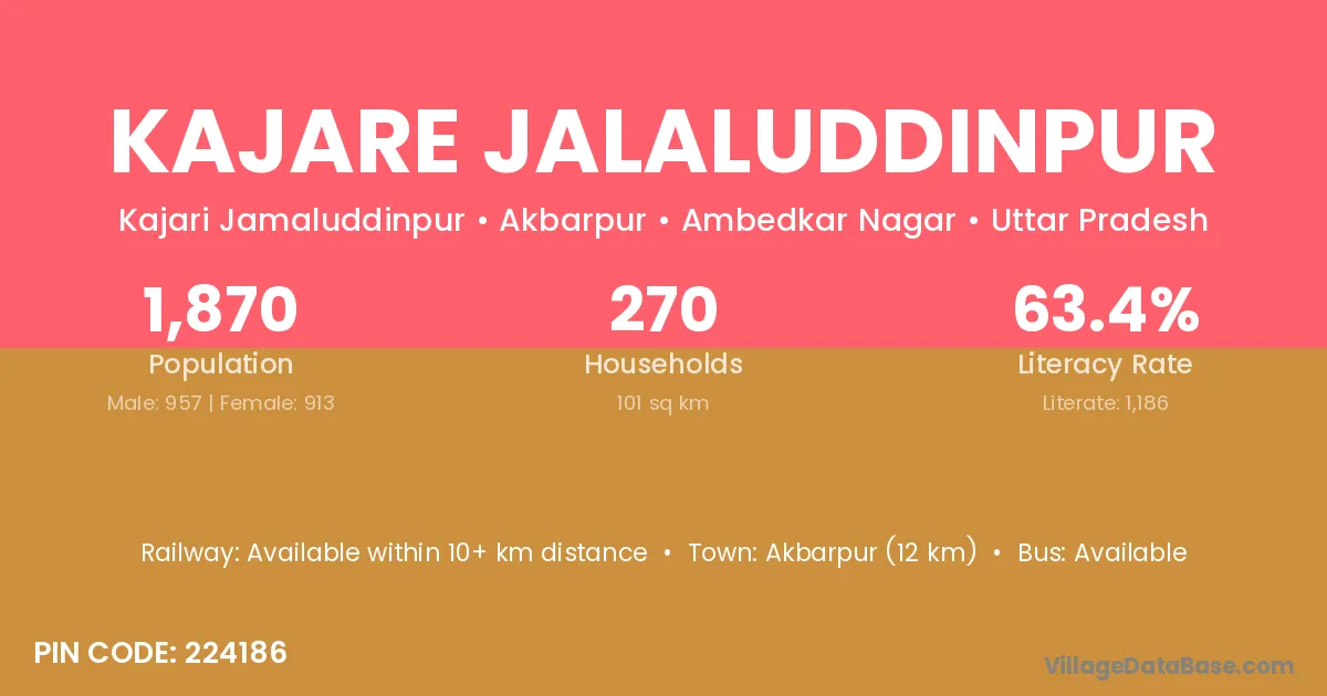 Akbarpur (12 km) is the nearest town to Kajare Jalaluddinpur village for major economic activities and is located approximately 12 km away.