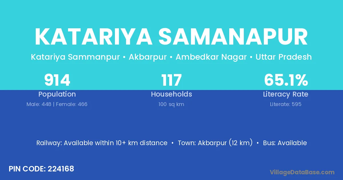 Akbarpur (12 km) is the nearest town to Katariya Samanapur village for major economic activities and is located approximately 12 km away.