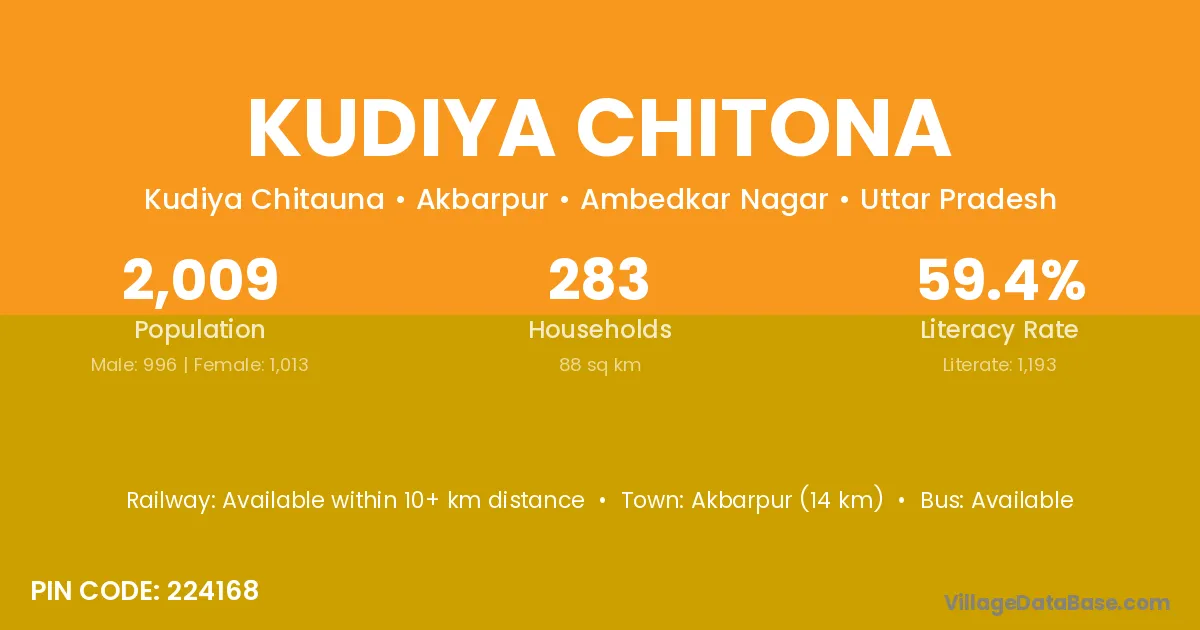 Akbarpur (14 km) is the nearest town to Kudiya Chitona village for major economic activities and is located approximately 14 km away.