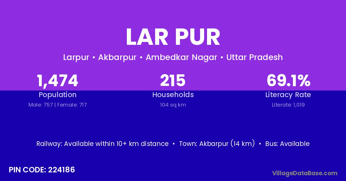 Akbarpur (14 km) is the nearest town to Lar Pur village for major economic activities and is located approximately 14 km away.