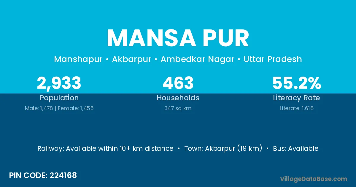 Akbarpur (19 km) is the nearest town to Mansa Pur village for major economic activities and is located approximately 19 km away.
