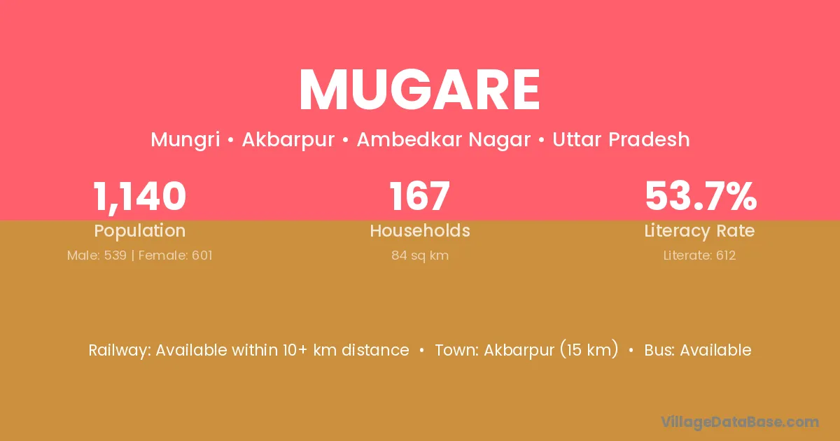 Akbarpur (15 km) is the nearest town to Mugare village for major economic activities and is located approximately 15 km away.