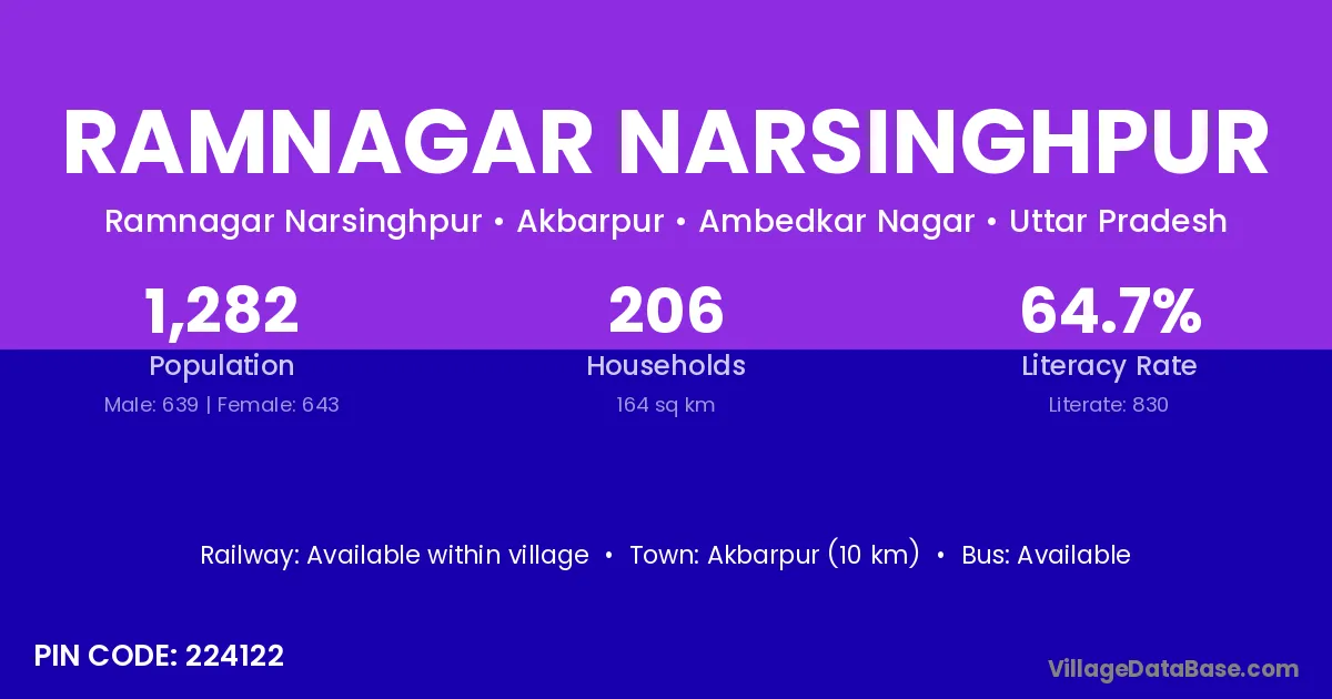 Akbarpur (10 km) is the nearest town to Ramnagar Narsinghpur village for major economic activities and is located approximately 10 km away.