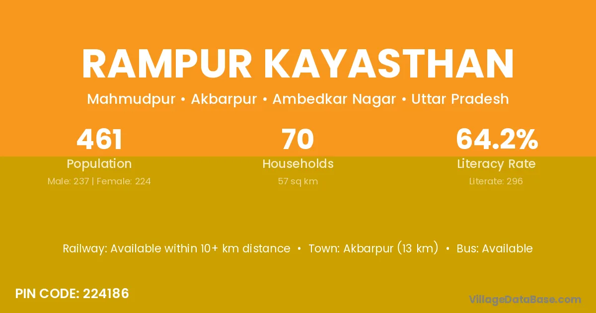 Akbarpur (13 km) is the nearest town to Rampur Kayasthan village for major economic activities and is located approximately 13 km away.