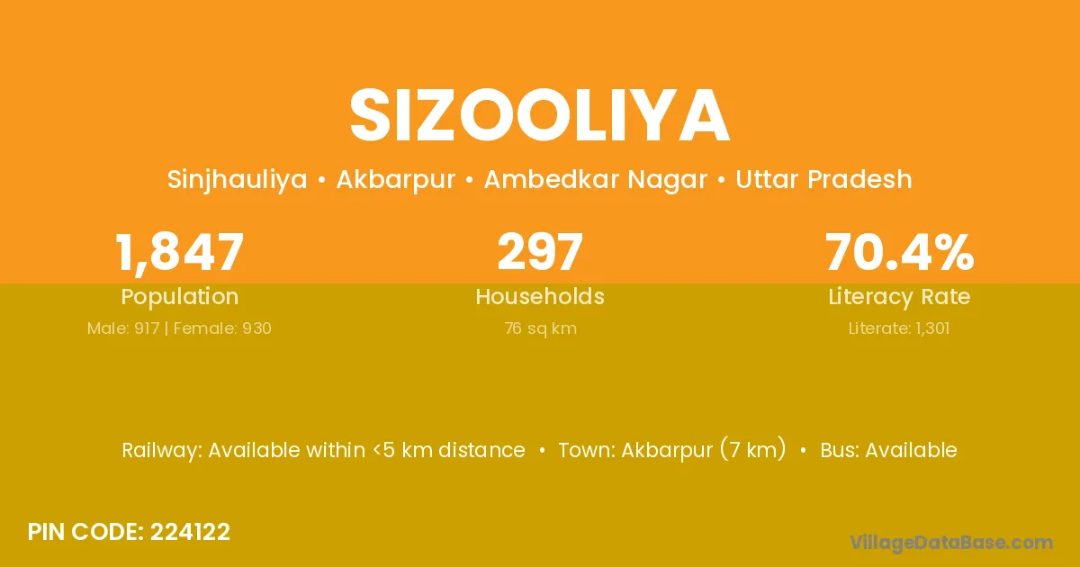 Akbarpur (7 km) is the nearest town to Sizooliya village for major economic activities and is located approximately 7 km away.