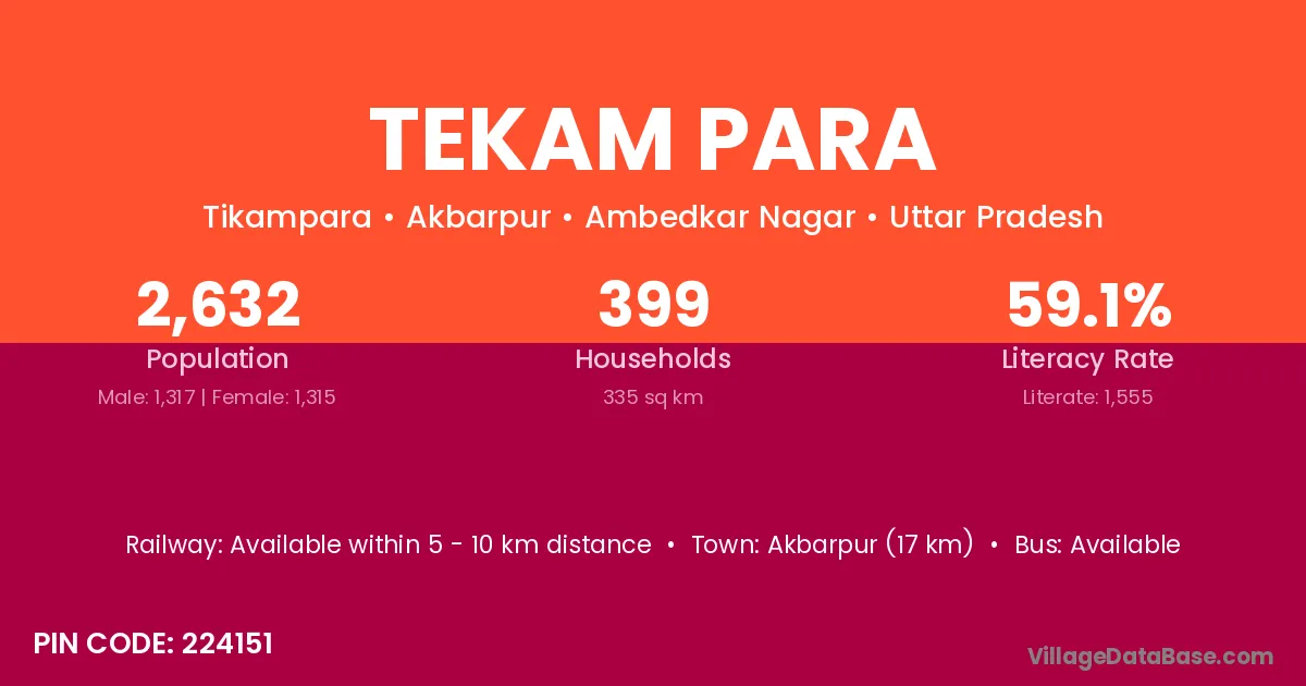 Akbarpur (17 km) is the nearest town to Tekam Para village for major economic activities and is located approximately 17 km away.