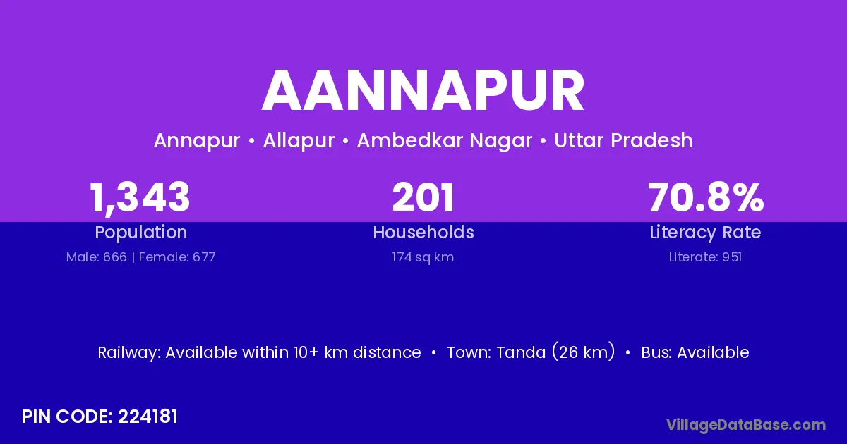 Tanda (26 km) is the nearest town to Aannapur village for major economic activities and is located approximately 26 km away.