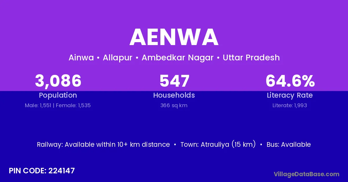 Atrauliya (15 km) is the nearest town to Aenwa village for major economic activities and is located approximately 15 km away.
