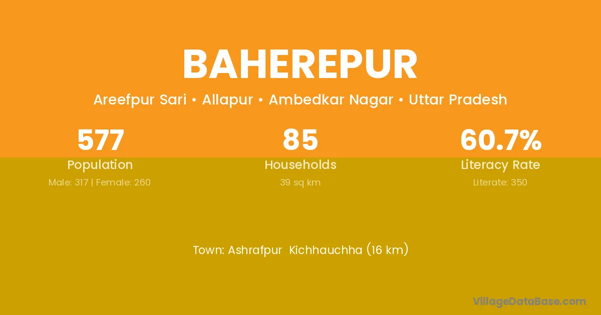 Ashrafpur Kichhauchha (16 km) is the nearest town to Baherepur village for major economic activities and is located approximately 16 km away.