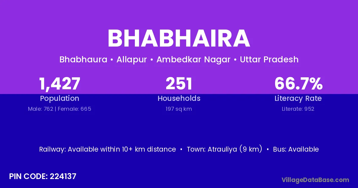 Atrauliya (9 km) is the nearest town to Bhabhaira village for major economic activities and is located approximately 9 km away.