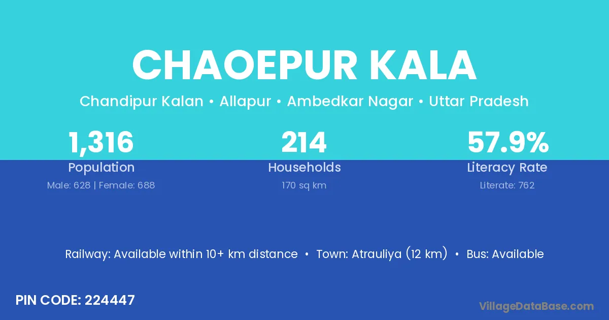 Atrauliya (12 km) is the nearest town to Chaoepur Kala village for major economic activities and is located approximately 12 km away.