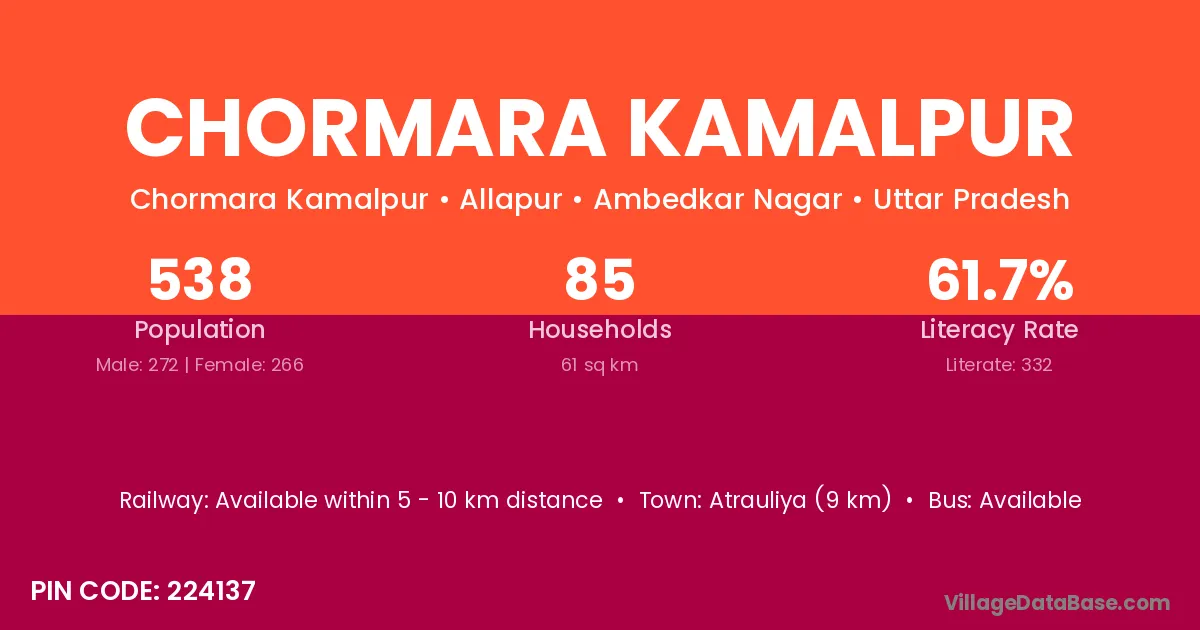 Chormara Kamalpur village has a total population of 538 people, of which 272 are males and 266 are females.