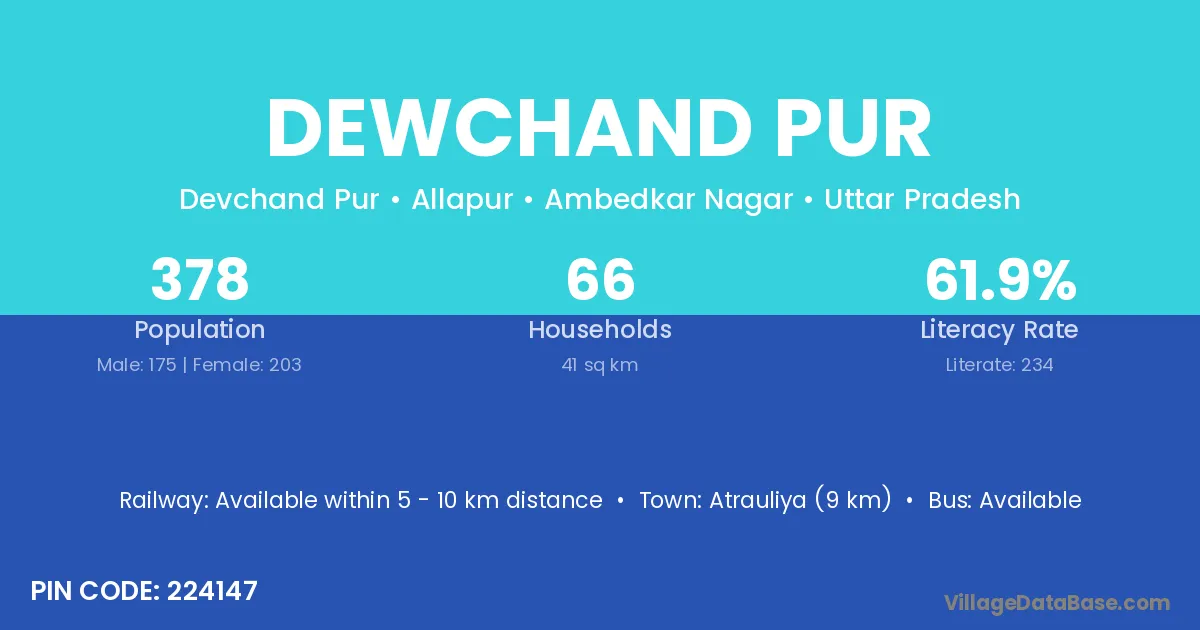 Dewchand Pur village has a total population of 378 people, of which 175 are males and 203 are females.