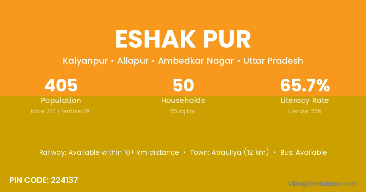 Atrauliya (12 km) is the nearest town to Eshak Pur village for major economic activities and is located approximately 12 km away.
