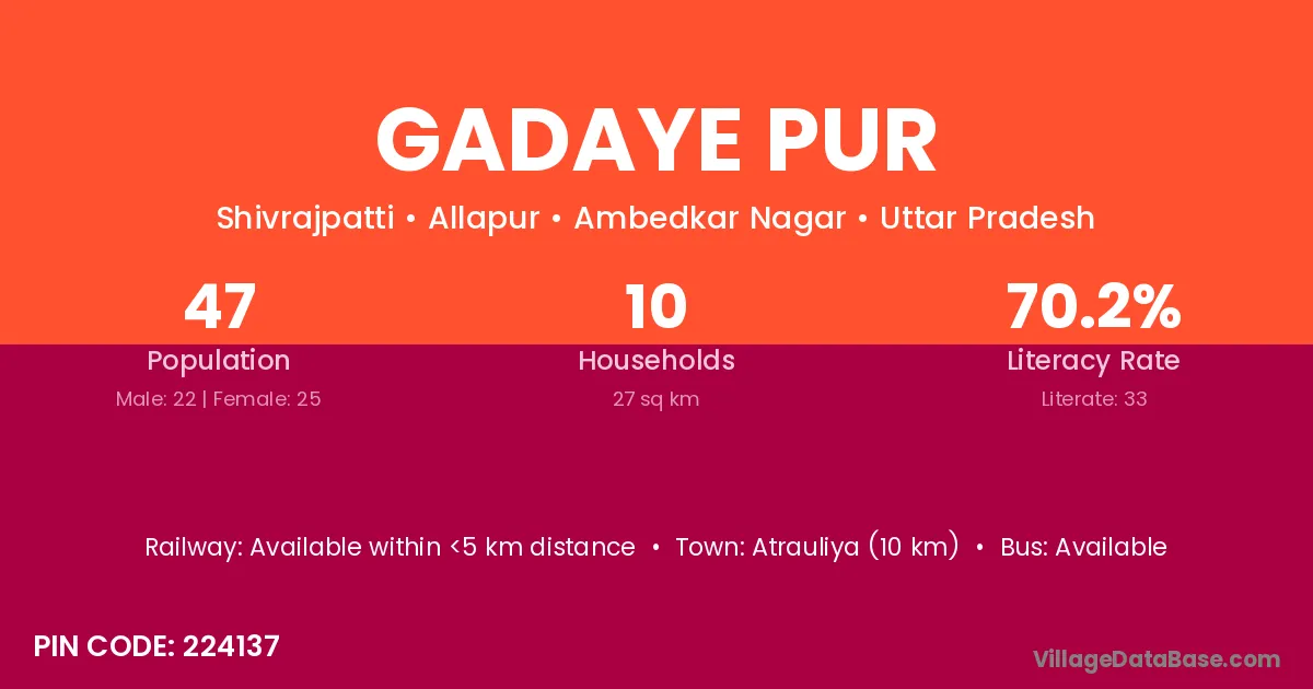 Atrauliya (10 km) is the nearest town to Gadaye Pur village for major economic activities and is located approximately 10 km away.