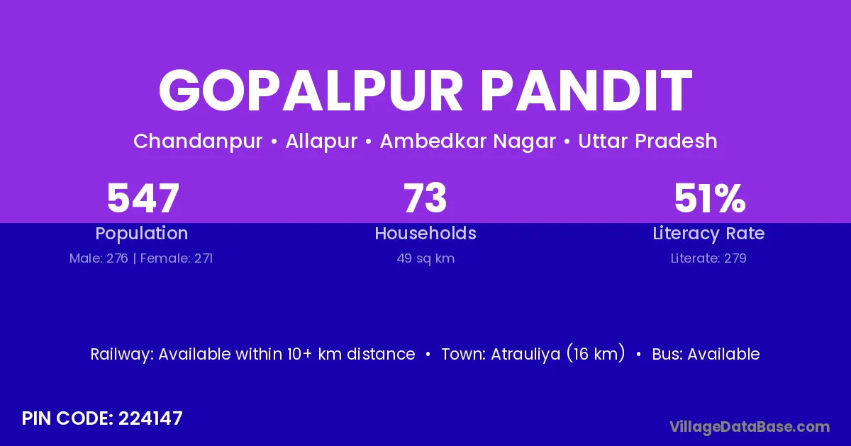 Gopalpur Pandit village has a total population of 547 people, of which 276 are males and 271 are females.